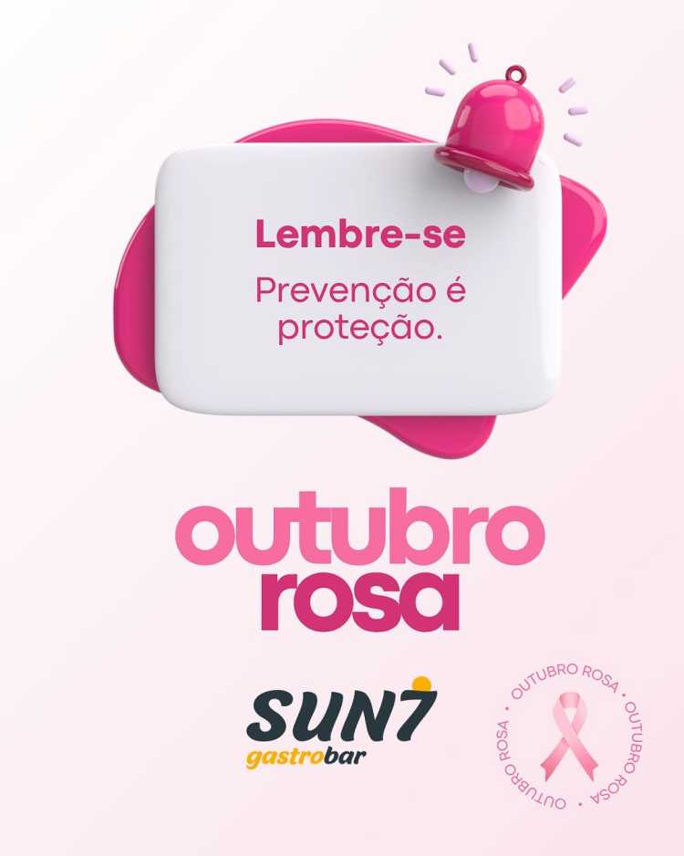 Outubro Rosa é sobre consciência, prevenção e cuidado com quem mais importa: você. 💗 No Sun7, apoiamos essa causa e lembramos que saúde e autocuidado são brindes que valem todos os dias. 🥂✨ #OutubroRosa #PrevencaoSalvaVidas #Autocuidado #Sun7Gastrobar #Saude #Consciencia